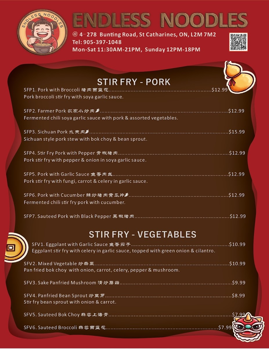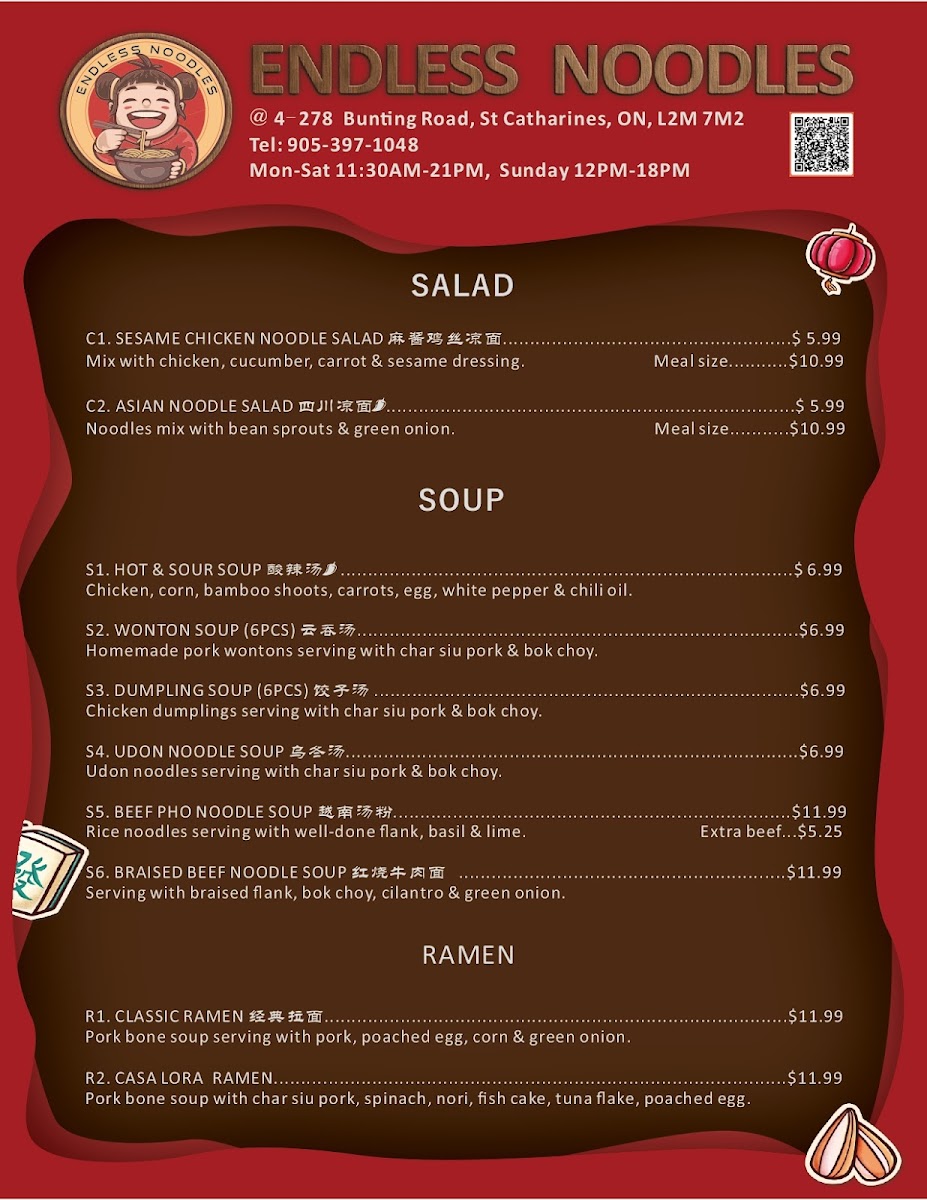 Welcome to Endless Noodles, where Asian flavors come alive in every bowl! Nestled in St. Catharines, this charming spot serves a diverse menu that highlights freshly prepared dishes, ensuring each bite is a delight. Customers rave about the scrumptious wonton and udon soups, rich in flavor and heartiness. The dumplings, including the renowned soup dumplings and dragon dumplings, are must-tries, offering a perfect balance of texture and taste.